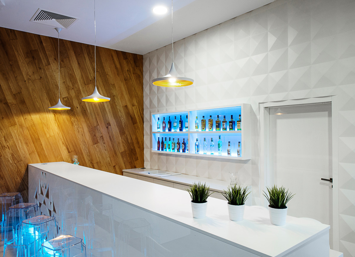 The bar combines wood with white, glossy surfaces. The ideal combination of these two materials is Kanlux AVINI lamps. Its honey-gold colour combined with white coherently integrates the interior and lights placed at the bar. In addition, the Kanlux ROUNDA v2 LED luminaire is placed on the ceiling, which additionally lights the space behind the bar.